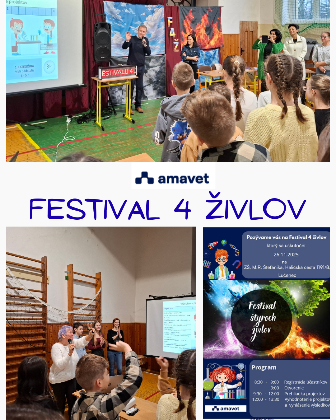 Festival 4 živlov sa uskutočnil 26. 11. 2025 pod záštitou AMAVET klubu – Klub vedcov Štefánik pri ZŠ M. R. Štefánika v Lučenci.